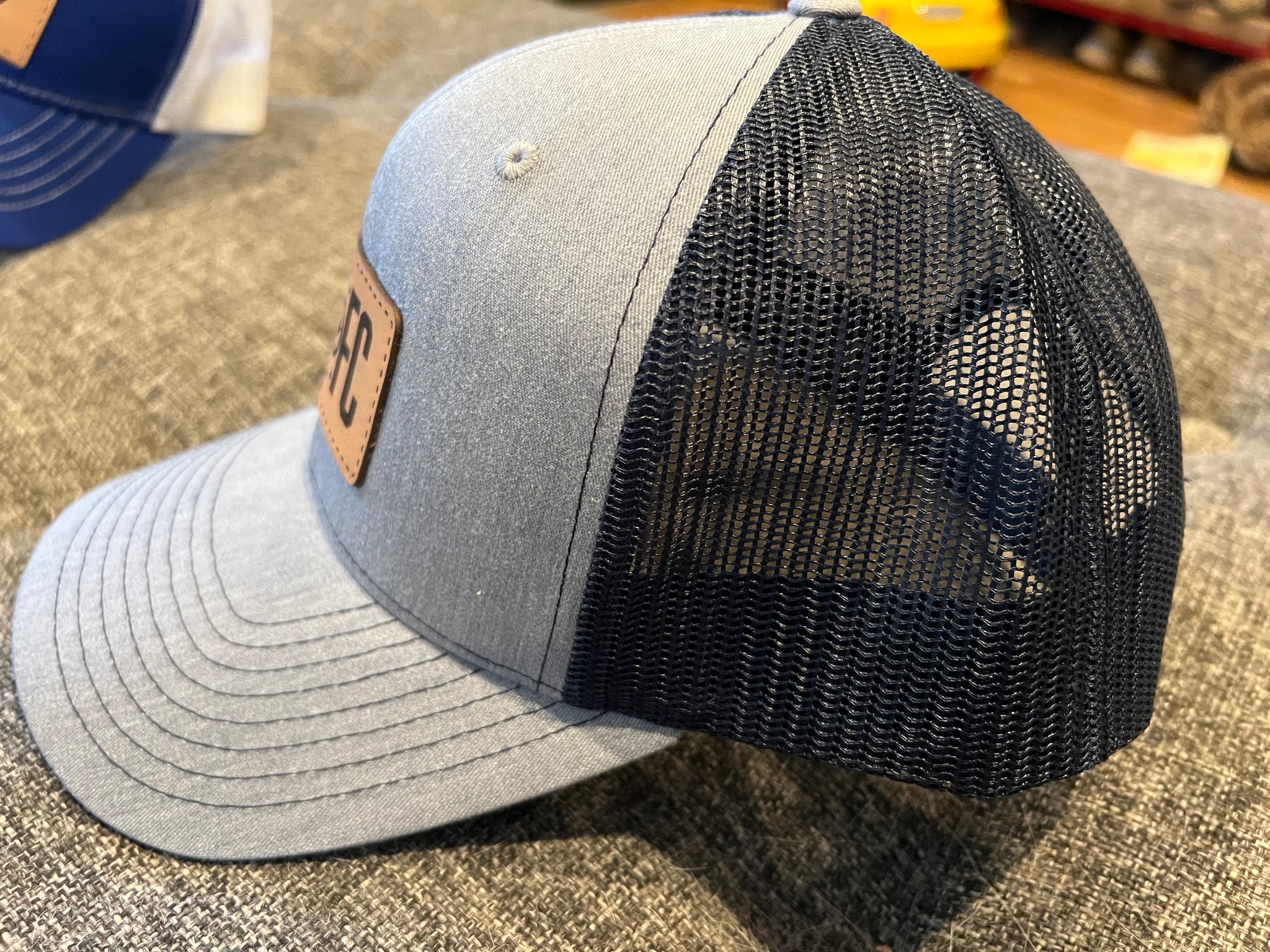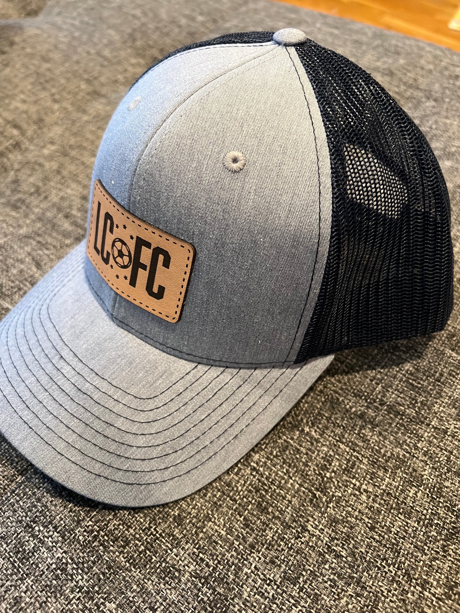 Genuine Leather Patch on a trucker style snap back! Support LCFC with this Heather Grey front and Navy Blue mesh!